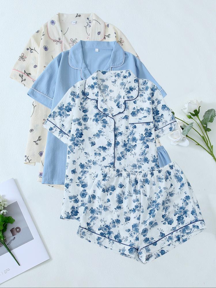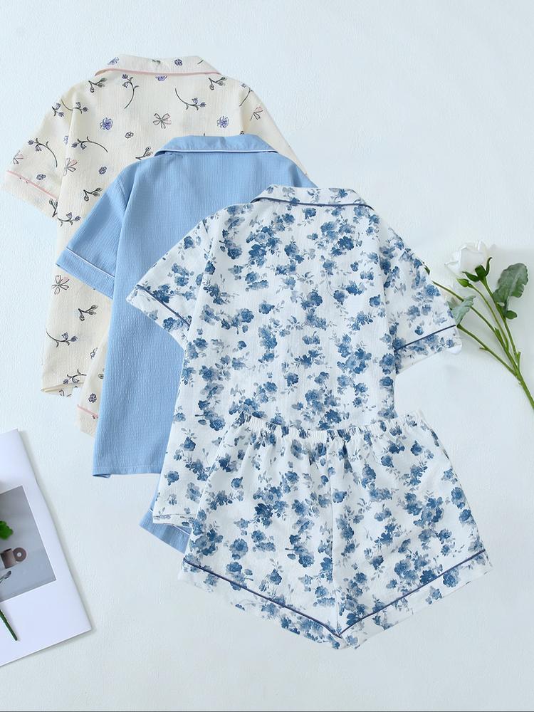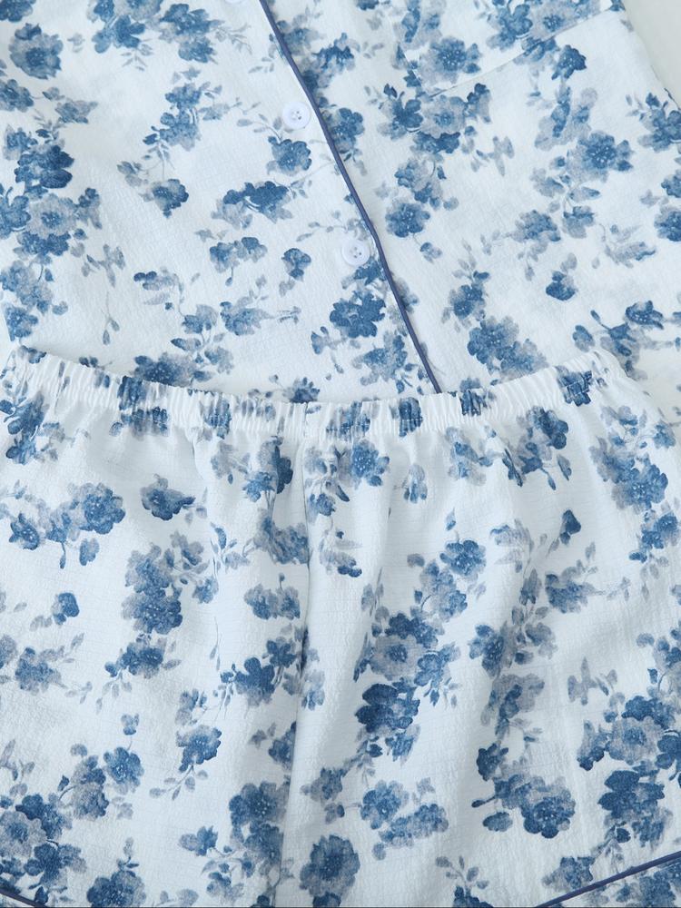 Women's Romantic Sky Blue Pajama Set – Cute All-Over Print Shirt & Elastic Waist Shorts, Summer Sleepwear