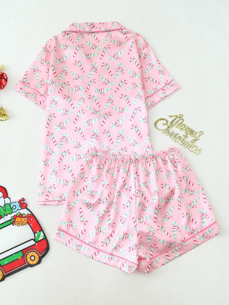 Women's Christmas Pajama Set – Short Sleeve Lapel Top & Elastic Waist Shorts, Comfortable Two-Piece Sleepwear