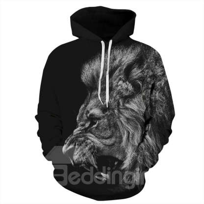 Unique Long Sleeve Grey Lion Face Roar Pattern Pocket 3D Painted Hoodie